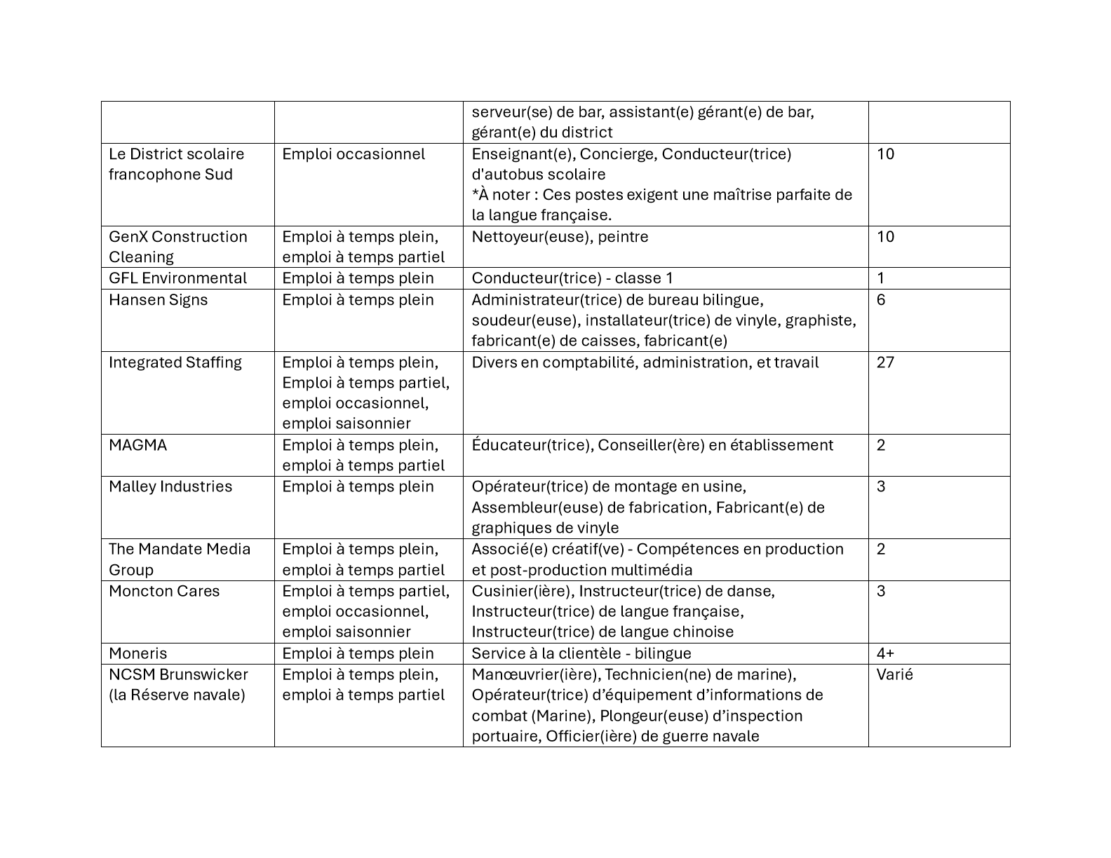 Veuillez consulter ci-dessous la liste des employeurs participants et les postes disponibles.